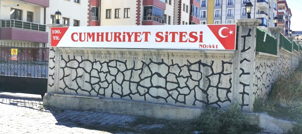 Site yöneticisi Musa Kırkayak, Atatürk Caddesi’nde bulunan sitelerinin adını Cumhuriyetin 100. Yıldönümü nedeniyle “Cumhuriyet Sitesi” olarak değiştirmekten mutluluk duyduklarını, tüm site sakinlerinin aldığı kararla tabelayı yerleştirdiklerini söyledi.