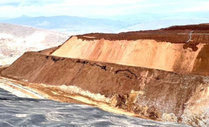 Fotoğraflarda siyanürden arındırılmış liç adı verilen toprakların istiflendiği alanda çatlaklar olduğu ve bir makinenin de çatlaklara saplanarak yana doğru eğildiği görüldü.