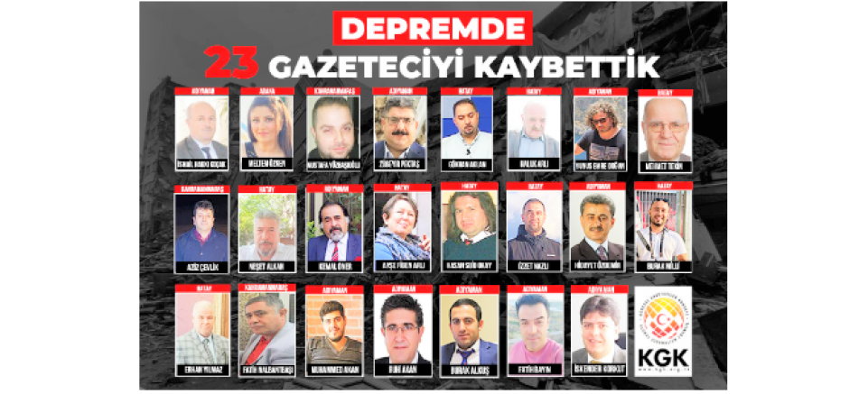 KÜRESEL Gazeteciler Konseyi (KGK) Genel Başkanı Mehmet Ali Dim, deprem bölgesindeki gazetecilerle sürekli iletişim halinde olduklarını belirterek, “Her gün yeni bir acı haberle sarsılıyoruz. Deprem nedeniyle yaşamını yitiren gazetecilerin sayısı maalesef 23 oldu. Henüz haber alınamayan meslektaşlarımız var. Yaralı olarak kurtulanlar ve tedavisi devam edenler var Kurtarma ve enkaz kaldırma çalışmaları sürerken korkarım ki, yeni acı haberler alacağız. Vefat eden meslektaşlarımızı rahmetle anıyoruz. Kayıplarımızın daha da artmaması ortak duamızdır” dedi.
