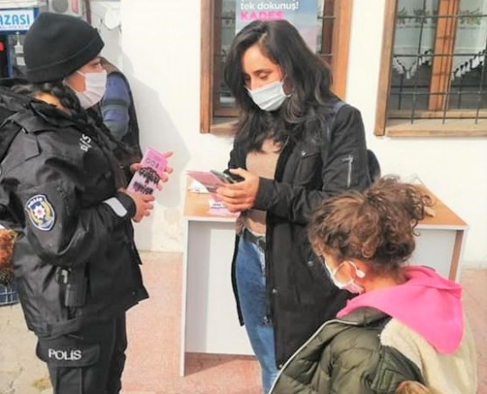 İlçe Emniyet ekipleri kadınlara, uygulamayı anlatıp, şiddetle mücadele konusunda bilgi vererek, broşür ve maske dağıttı.