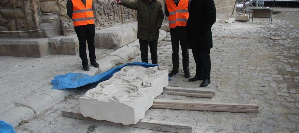 1985 yılında UNESCO Dünya Miras Listesi’ne kültürel varlık olarak dahil edilen Divriği Ulu Camii ve Darüşşifası’nda başlatılan tarihin en kapsamlı restorasyonunda çalışmalar sürüyor. En az 3 yıl daha sürmesi beklenen restorasyon çalışmalarını yerinde inceleyen Kaymakam Muhammet ÖZTABAK; firma sahiplerinden Ömer ÜSTÜNKAYA, şantiye şefi Cem BİLGİNPERK, İnşaat mühendisi Çağdaş GÜRBÜZ ve Mimar Ege SEVTEKİN’den bilgi aldı.
