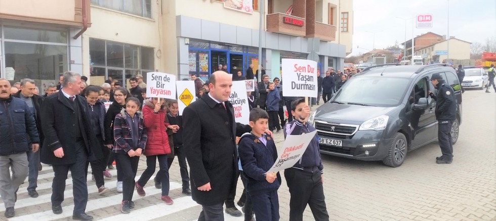Bu kapsamda düzenlenen programla, ilçemizde öğrenciler ve vatandaşlar yaya geçidi uygulamasının yapıldığı 4 yol kavşağında toplanarak trafik bilincine dikkat çekti.