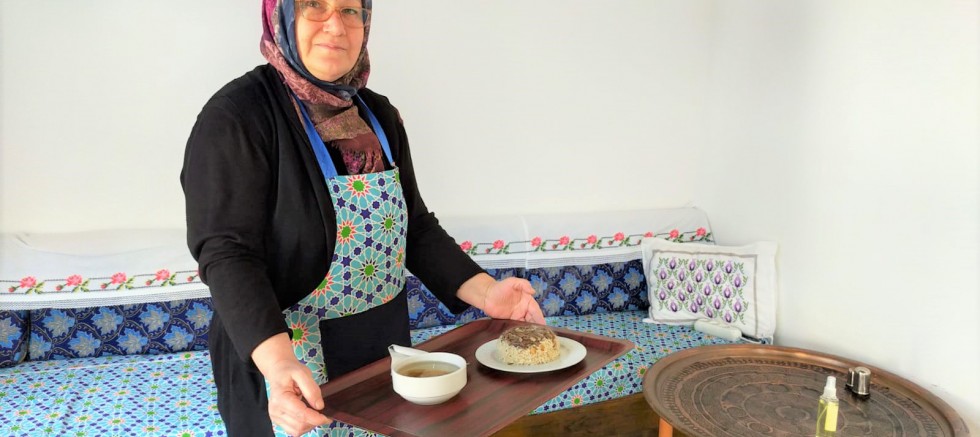 - Orta boy bir soğan soyulup çok incecik doğranır ve iki yemek kaşığı kadar sıvı yağda pembeleştirilir. Bademler ilave edilerek bir kaç dakika kadar kavrulur. Pişen etler (istenirse didiklenmiş olarak), haşlanan nohutlar ve beş dakika kadar suda bekletilip yıkanıp süzdürülen üzümler tencereye ilave edilerek karıştırılır. Üzerine tuz, karabiber ve yenibahar eklenir.