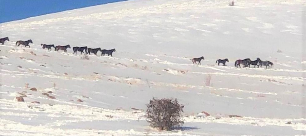Onlarca yılkı atlarının tek sıra halindeki dizilişi ortaya seyirlik görüntüler çıkarttı. / Murat Nedim Bozkurt