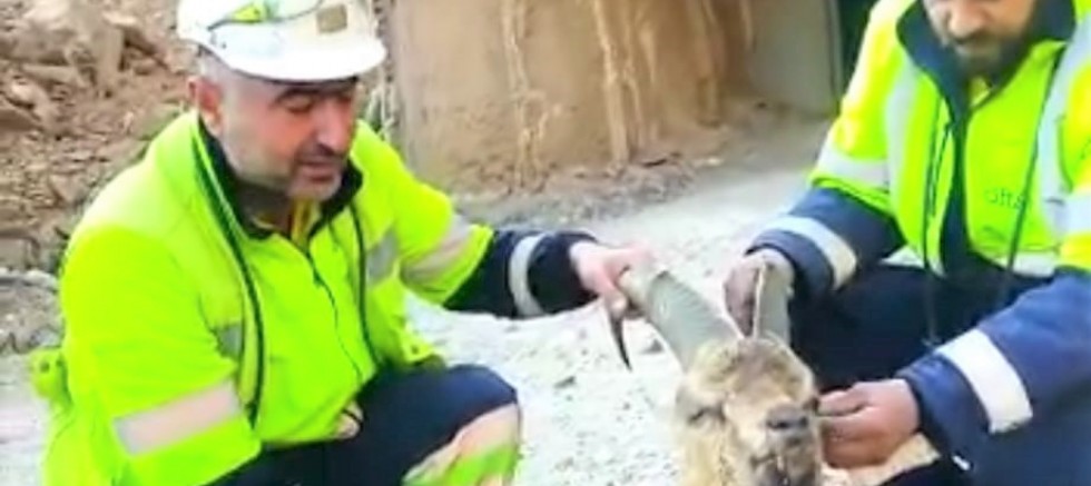 Yaban keçisini gören bölgede faaliyette bulunan Çiftay şirketin çalışanları alıp şantiye girişine getirdi.